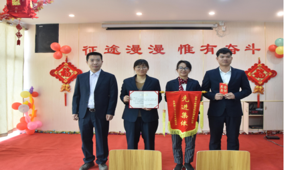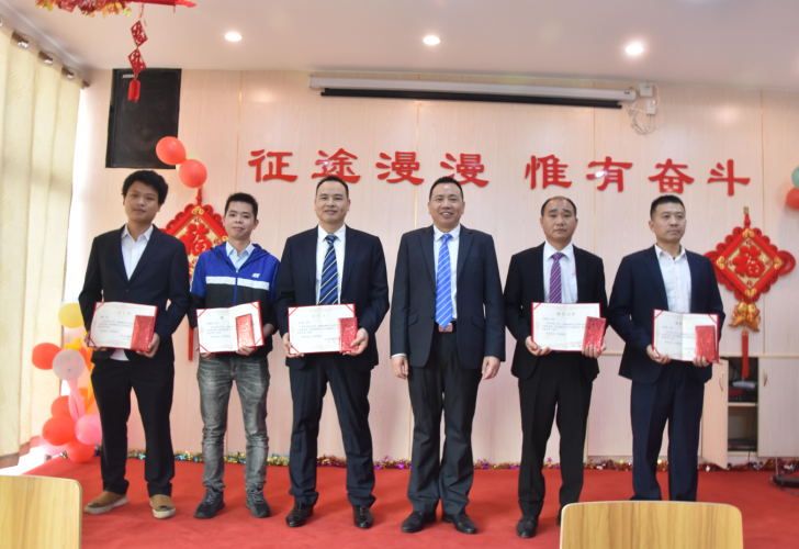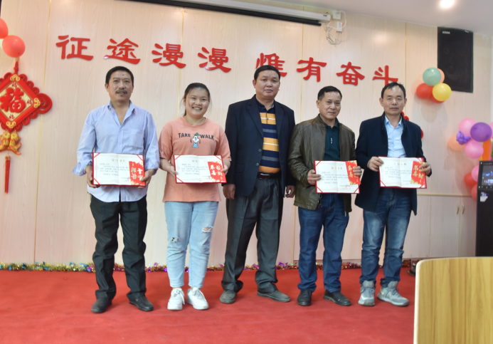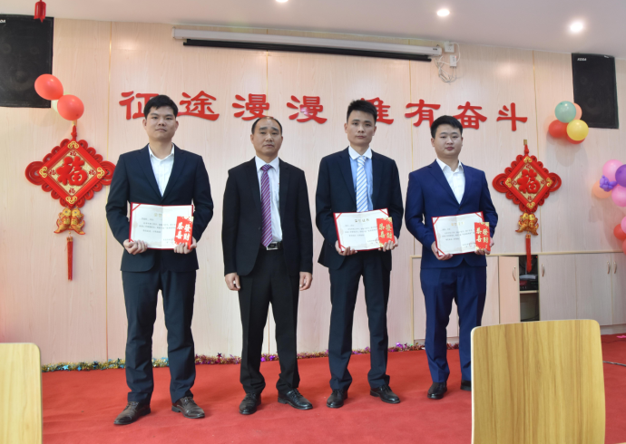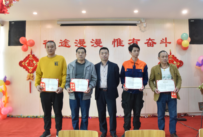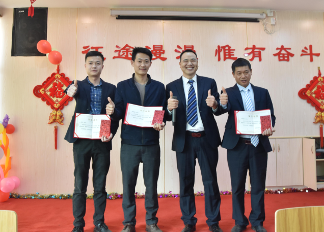營銷部經理伍綱強為邱高明、周美芳、黃榮先、龔超頒發先進個人獎