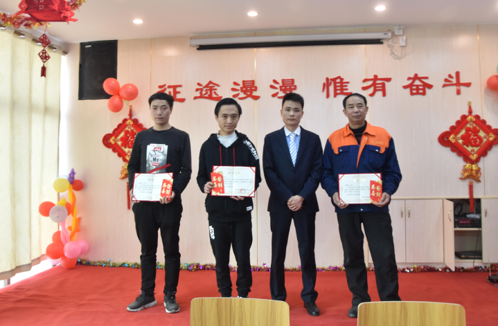 生產部經理廖小強為伍志強、柳敏捷、戴剛、韋進勇頒發先進個人獎